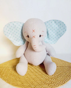 Com cerca de 30cm sentado e 35cm em pé, ele tem bracinhos e perninhas móveis, tromba enroladinha e detalhes de rostinho bordados que deixam sua expressão ainda mais fofa e carinhosa.